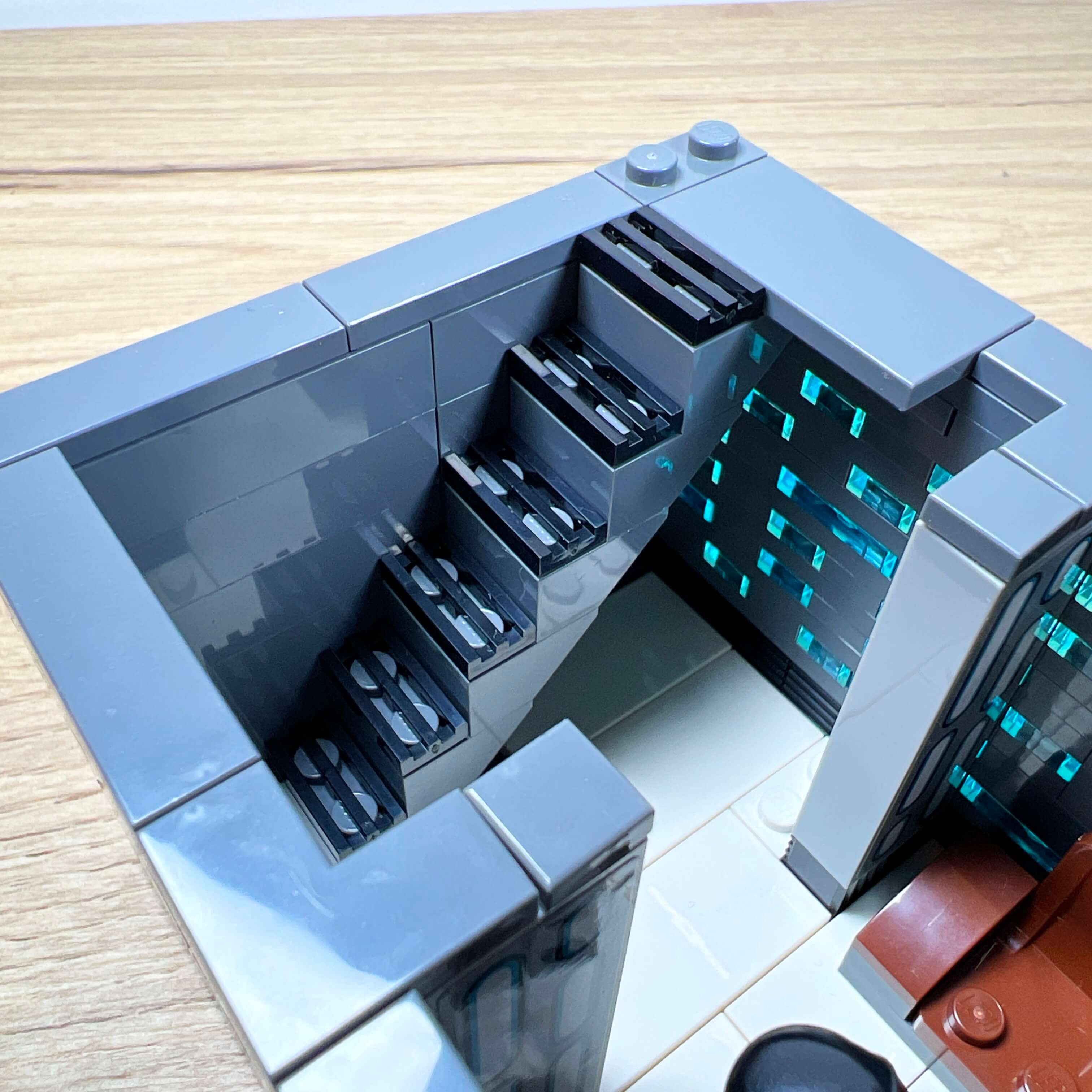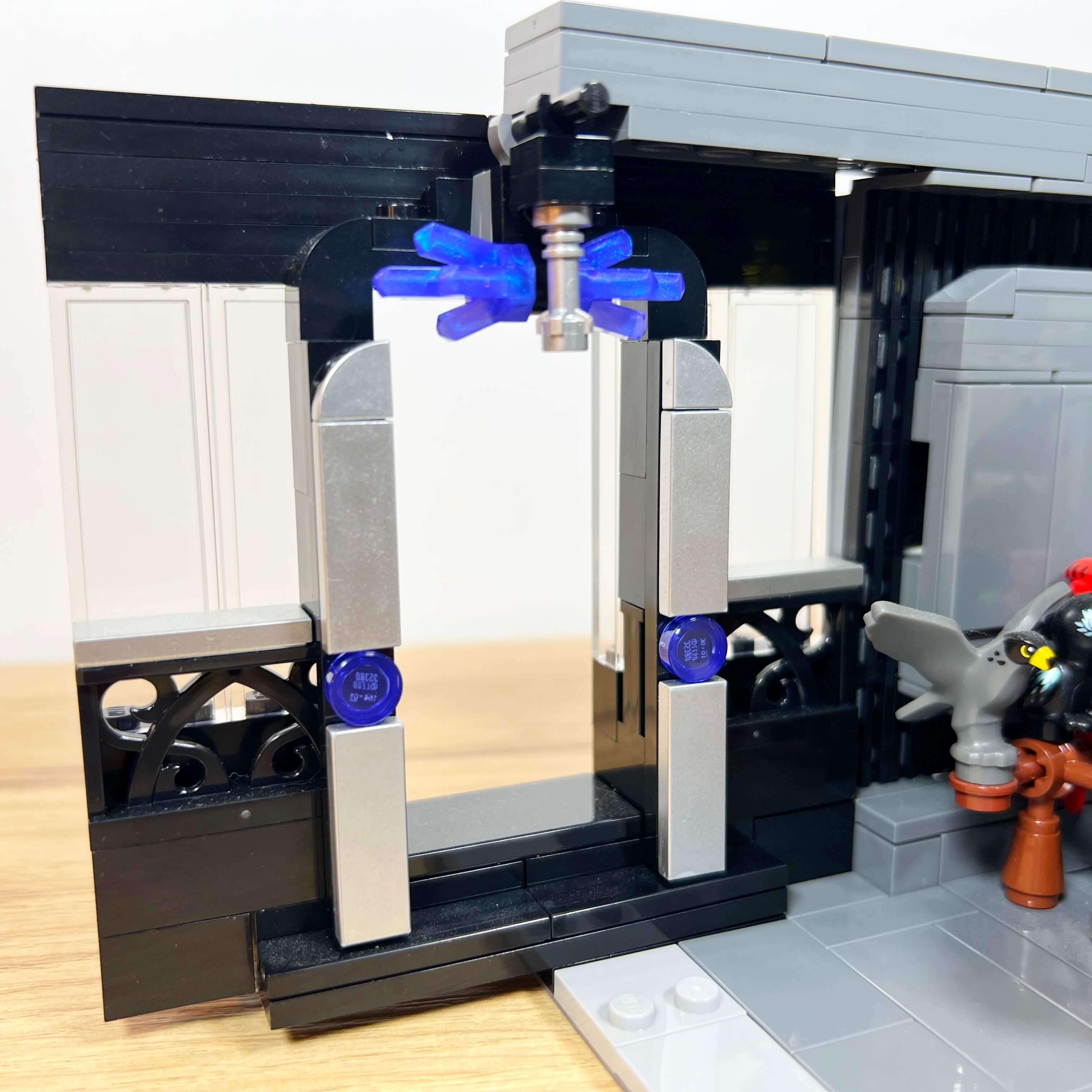 Pour les petites fenêtres éclairées qui parsèment la façade, j’ai utilisé du bleu clair transparent, assez proche de leur apparence dans le jeu. L’effet est plutôt réussi : ces pièces contribuent à l’ambiance nocturne du MOC.