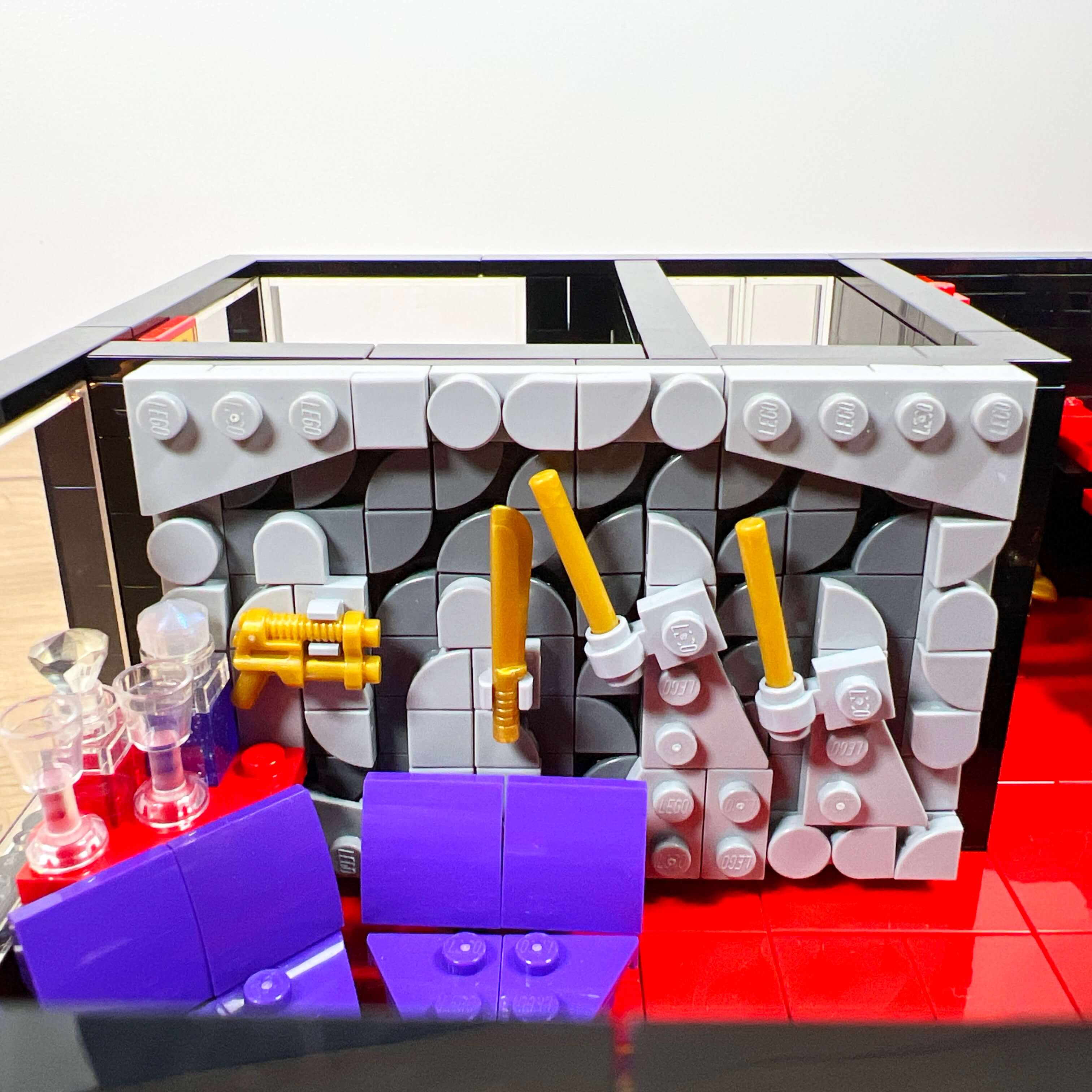 Je suis très content de cette partie du MOC. Le résultat correspond à ce que je voulais obtenir niveau ambiance : un lieu à la fois élégant et feutré, avec de nombreux éléments de décor qui tranchent avec la sobriété de la salle du trône et de la chambre du Conseil Noir. J’ai pris plaisir à créer toutes ces décorations qui s’inscrivent bien dans le style du jeu :