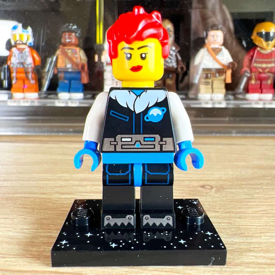 Avant de parler des figurines, difficile de ne pas citer les plates 2x3 qui sont fournies avec les figurines. Contrairement aux sets classiques, les figurines des séries CMF sont toutes fournies avec une plaque 2x3 avec une seule rangée de tenons en guise de support de présentation. La série 26 ne fait pas exception, mais se distingue par la présence de plaques tampographiées à la place des plaques noires habituelles: les parties lisses ont de petites étoiles blanches imprimées dessus! C’est à la fois plus joli pour exposer les figurines, mais c’est aussi très intéressant pour un MOC. En assemblant plusieurs de ces pièces et en cachant la ligne de tenons, il est possible de créer un fond étoilé pour un petit diorama.