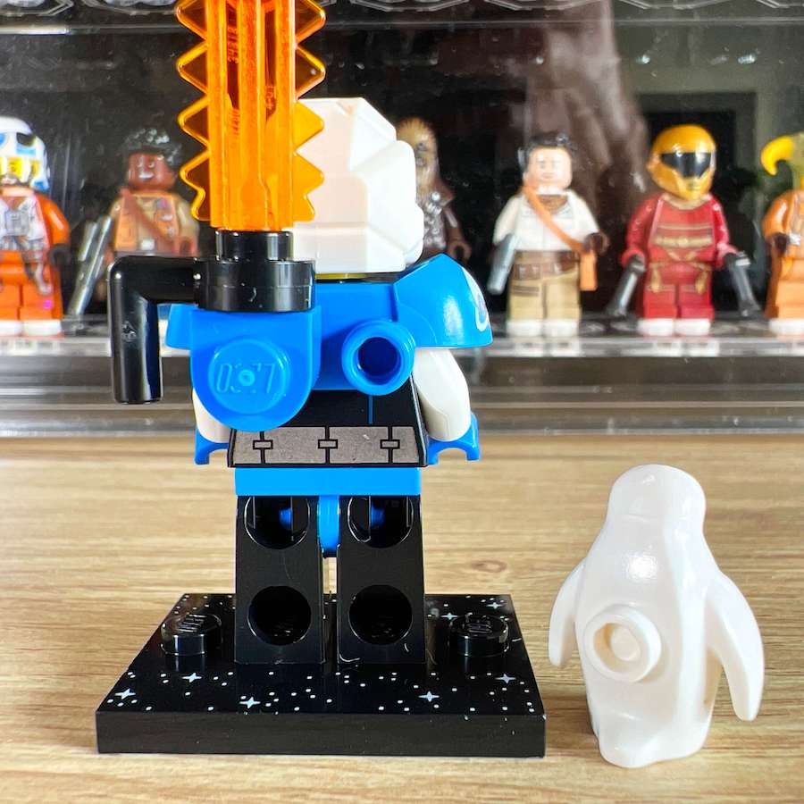 Avec la huitième figurine, on retourne dans le sérieux avec l’exploratrice de la planète de glace, une figurine hommage au thème Ice Planet des années 1993 et 1994, qui mettait en scène des astronautes travaillant sur une planète gelée. Comme pour M-Tron, la figurine rend hommage à ses ancêtres des années 90 sans les dénaturer. Si la base de la figurine reste la même (jambes et torse noirs, bras blancs, bassin et mains bleus), la figurine dispose de belles amélioration. Si les jambes sont entièrement noires, les pieds disposent de crampons argentés tampographiés, et le torse dispose d’une nouvelle tampographie reprenant les éléments des figurines originales avec une ceinture argentée, le logo Ice Planet et un col de fourrure. Une pièce d’armure apparue dans la gamme Star Wars est ici fournie en bleue pour donner de la carrure à la figurine. Elle dispose du logo Ici Planet sur l’épaule et les deux tenons dans le dos permettent de ranger la tronçonneuse orange transparente, un accessoire qui équipait déjà les figurines de l’époque. La tête de femme dispose d’un double visage, et une pièce e cheveux rouge est fournie, référence à la seule femme parmi les trois figurines originales du thème Ice Planet qui avait des mèches rouges imprimées sur les bords du visage. Si les figurines originales étaient équipées d’un simple casque blanc avec une visière orange iconique qui n’est plus produite, Lego a choisi de créer une nouvelle pièce reprenant l’allure de la pièce d’origine en la modernisant. Enfin, un pingouin robotique accompagne la figurine, bien que je ne sache pas à quoi il fait référence. Comme avec la figurine M-Tron, cette nouvelle version d’un personnage Ice Planet rend un bel hommage au thème des années 90, et ne manquera pas de faire plaisir aux nostalgiques.