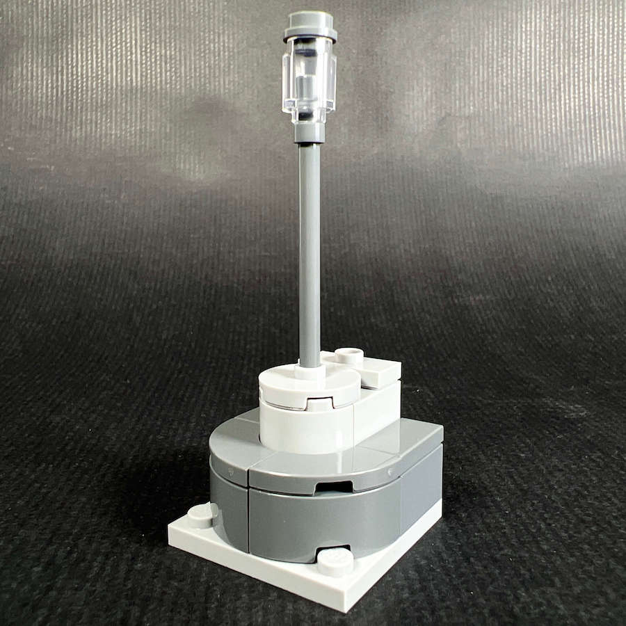 Le deuxième élément est un lampadaire. Sa présence dans le set a suscité beaucoup de commentaires et d’incompréhension sur les réseaux sociaux, certains le voyant comme un ajout inutile et ridicule pesant sur le budget du set. C’est effectivement un élément dont l’absence n’aurait rien enlevé au set, et je suppose que sa présence sert seulement à fournir un support pour fixer la pièce transparente de lévitation du berceau que j’évoquais précédemment. Comme beaucoup je me serais bien passé de ce lampadaire, mais je dois reconnaître qu’il est assez fidèle à ceux présents à l’endroit où la scène se déroule dans la série, et si je ne me trompe pas, c’est le premier élément issu du temple Jedi qui apparaît chez Lego.